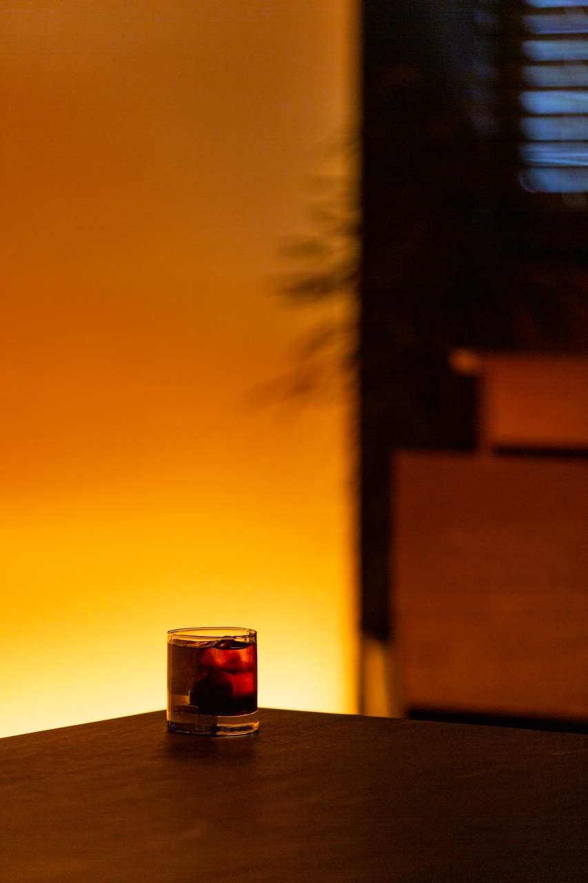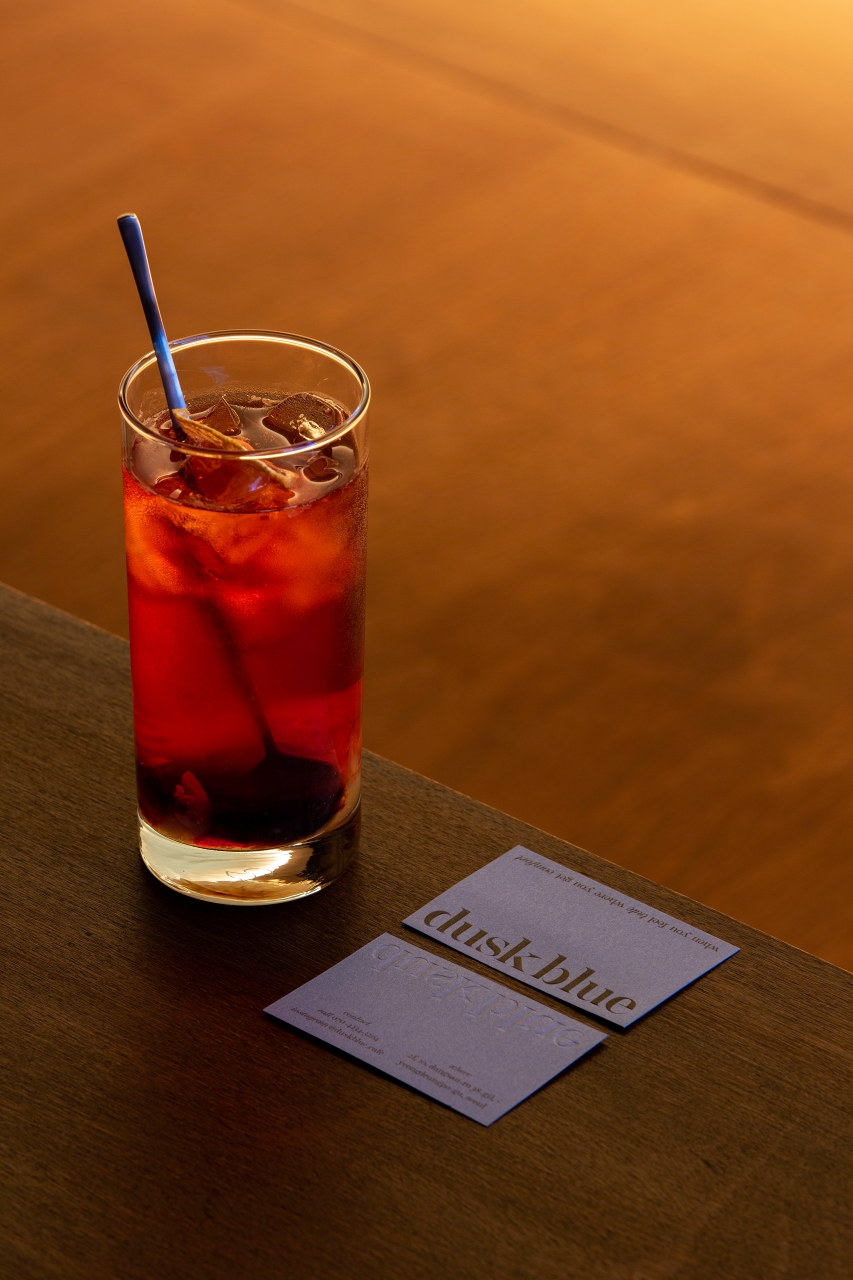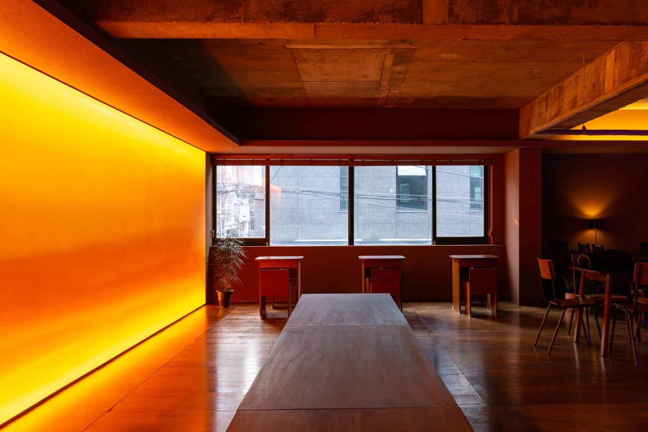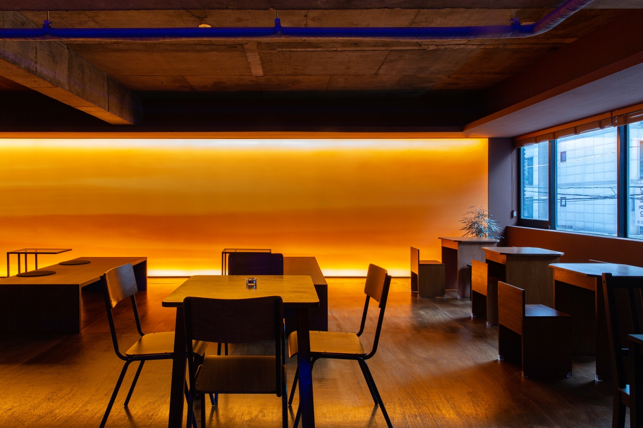 공간은 단순하고 정직합니다. 넓게 트인 홀을 중심으로, 한쪽 벽면 전체를 감싸는 ‘노을 벽’이 있습니다. 이 벽은 하루의 색을 담는 캔버스처럼 시간에 따라 다른 분위기를 만들어냅니다. 낮에는 부드러운 햇살이 머물고, 저녁이 되면 온 공간이 푸른빛과 붉은빛이 섞인 그라데이션으로 물듭니다. 벽면의 조명과 그림자, 그리고 은은한 음악은 손님 각자의 감정에 맞춰 조용히 배경이 되어줍니다.