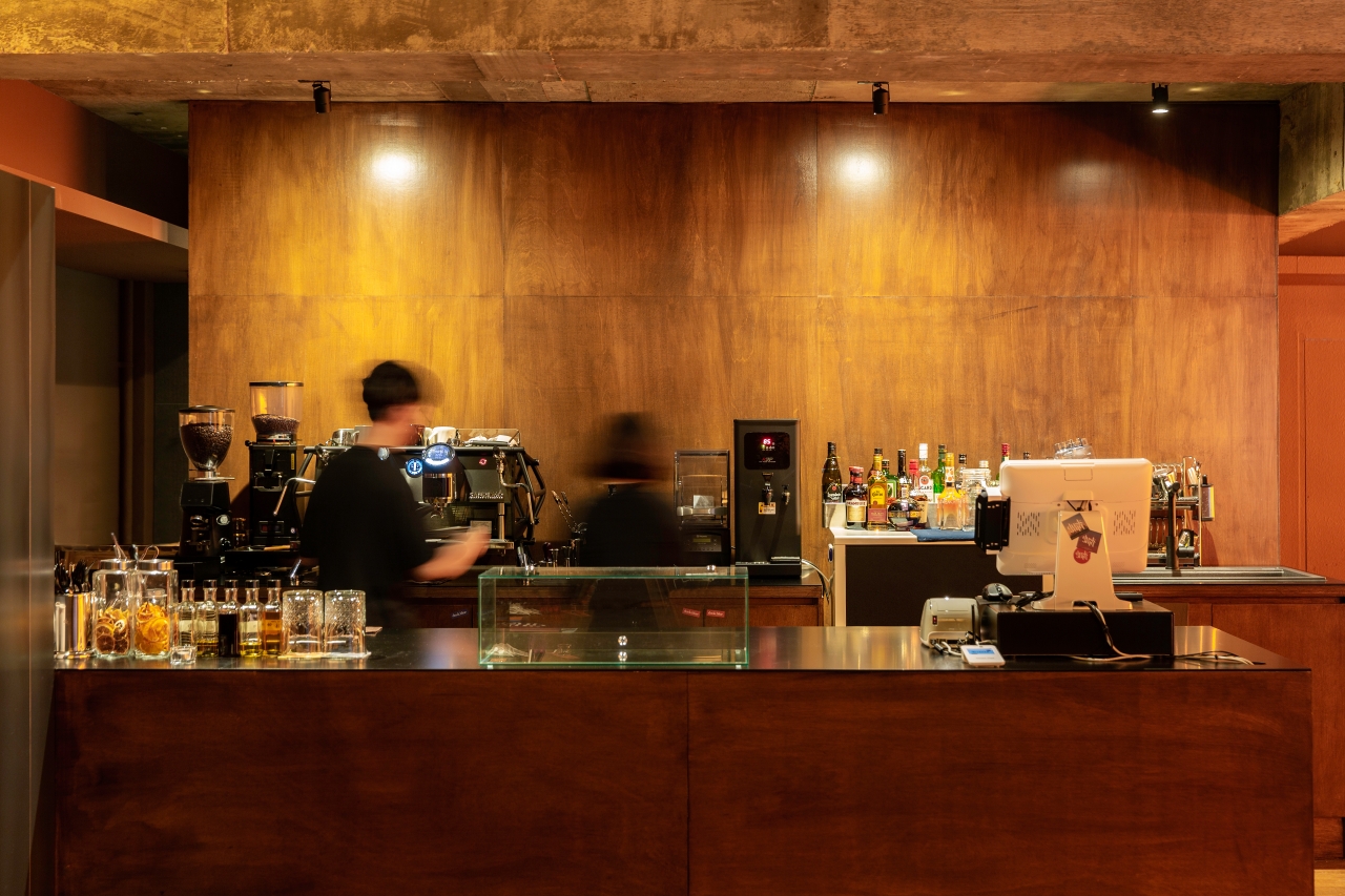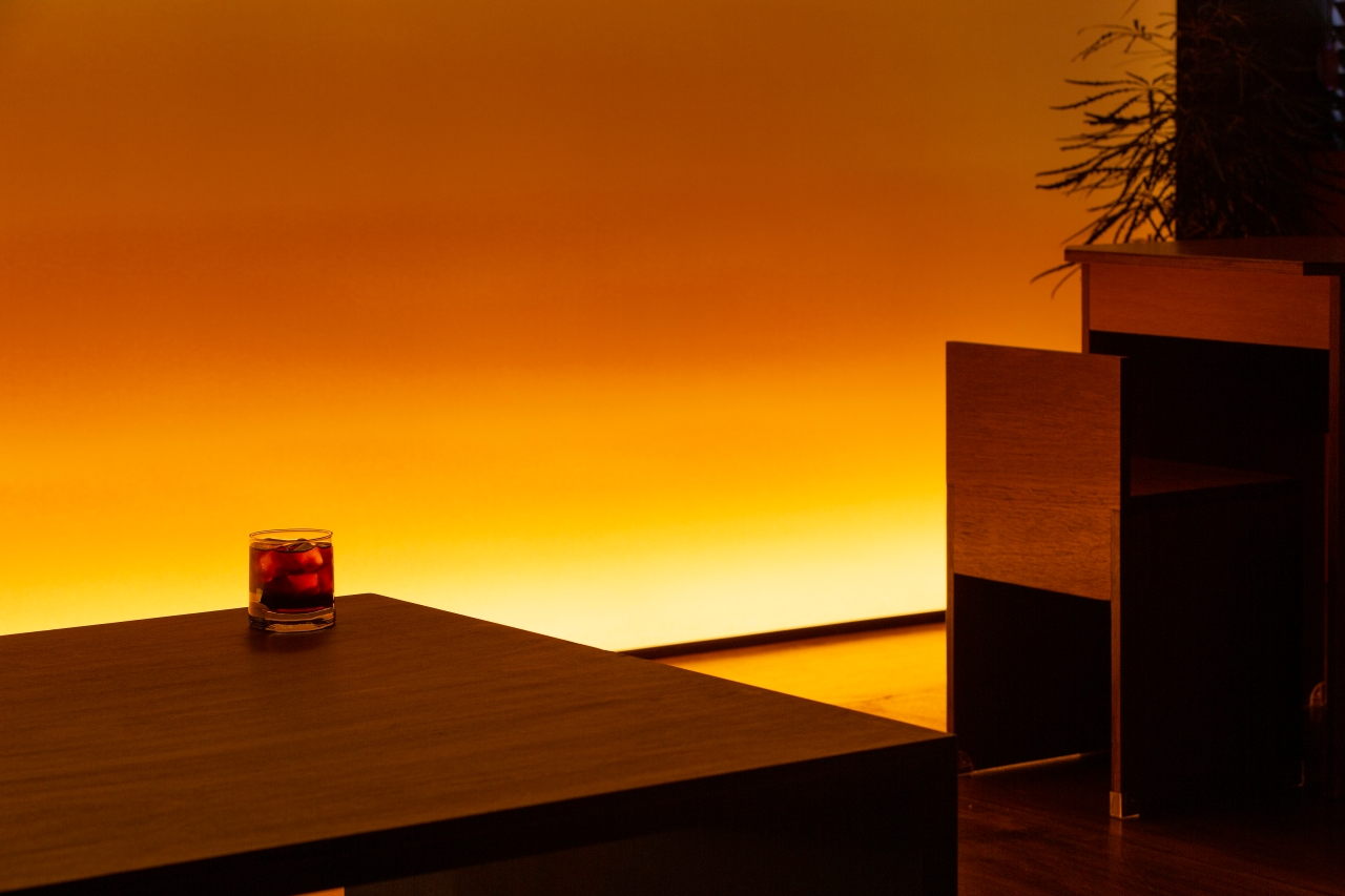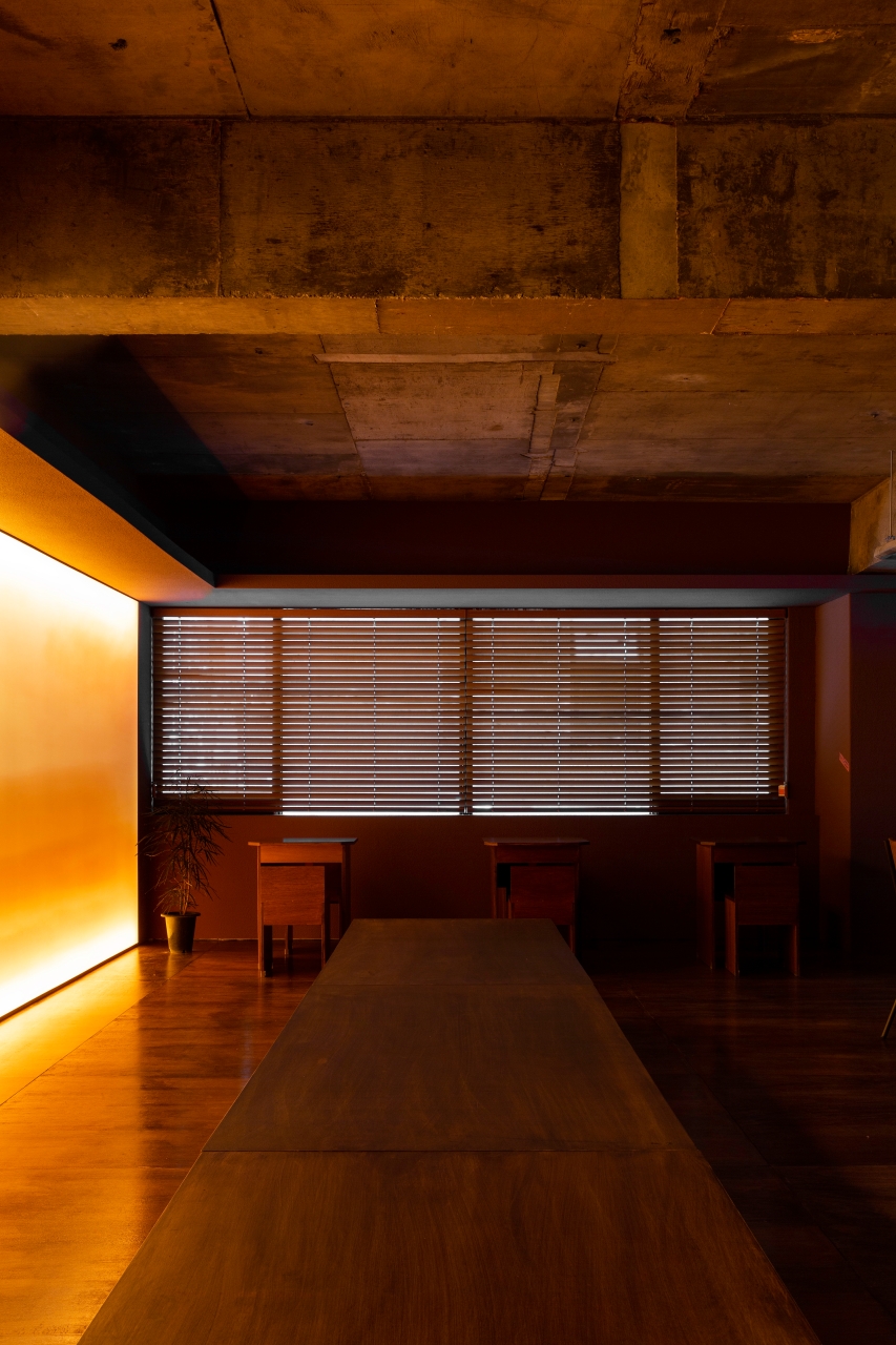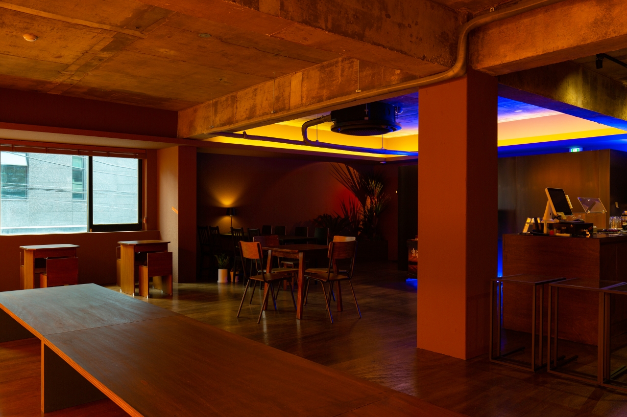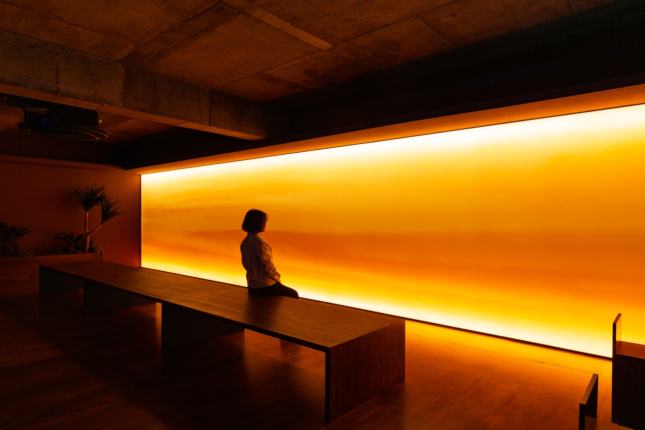 공간은 단순하고 정직합니다. 넓게 트인 홀을 중심으로, 한쪽 벽면 전체를 감싸는 ‘노을 벽’이 있습니다. 이 벽은 하루의 색을 담는 캔버스처럼 시간에 따라 다른 분위기를 만들어냅니다. 낮에는 부드러운 햇살이 머물고, 저녁이 되면 온 공간이 푸른빛과 붉은빛이 섞인 그라데이션으로 물듭니다. 벽면의 조명과 그림자, 그리고 은은한 음악은 손님 각자의 감정에 맞춰 조용히 배경이 되어줍니다.