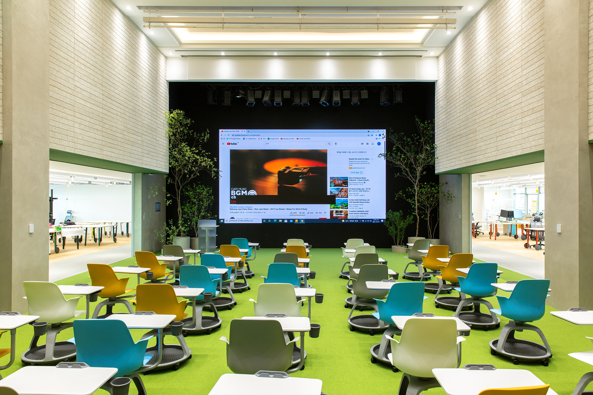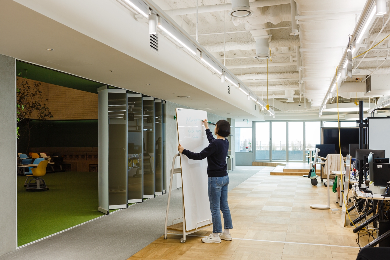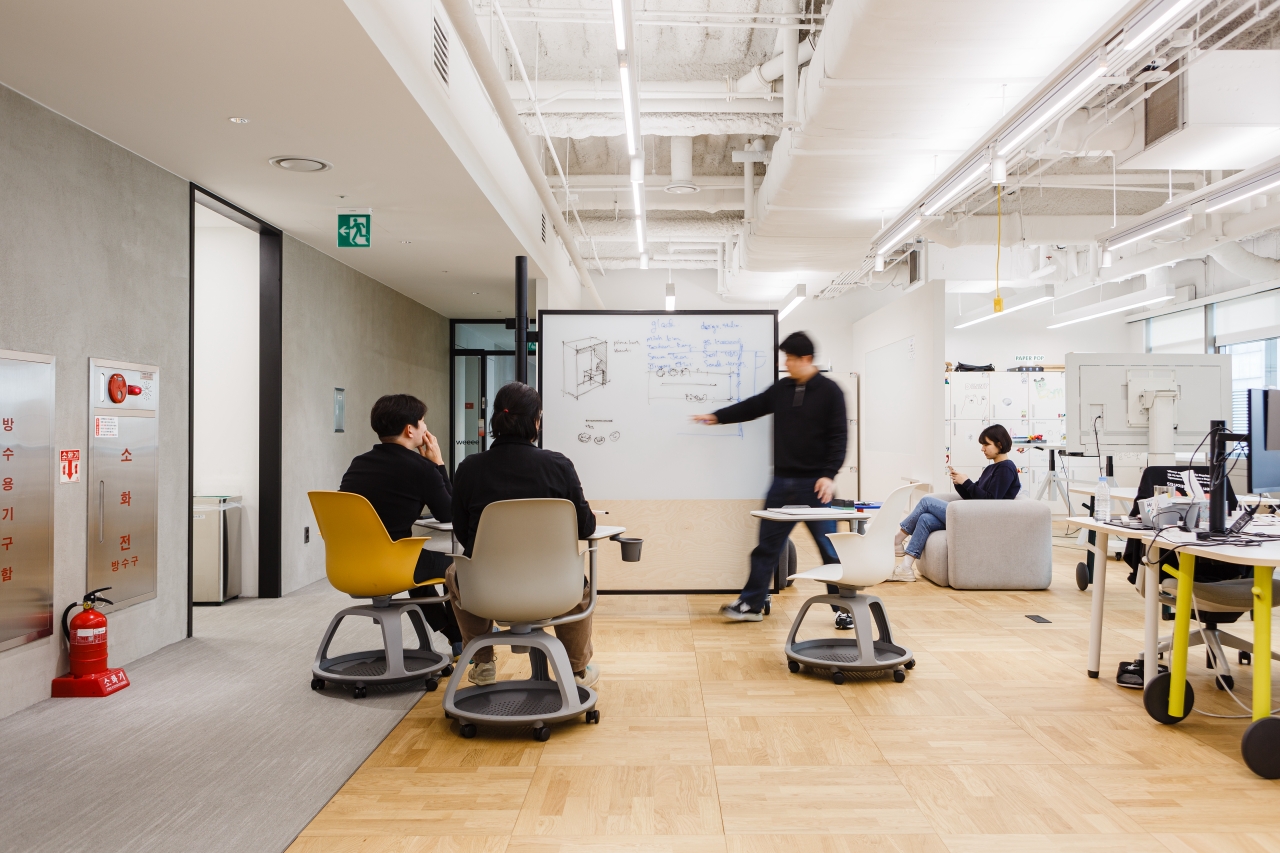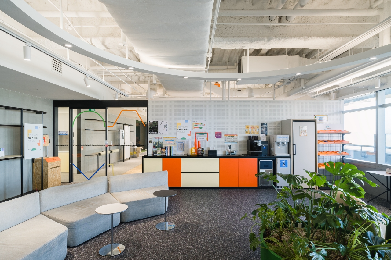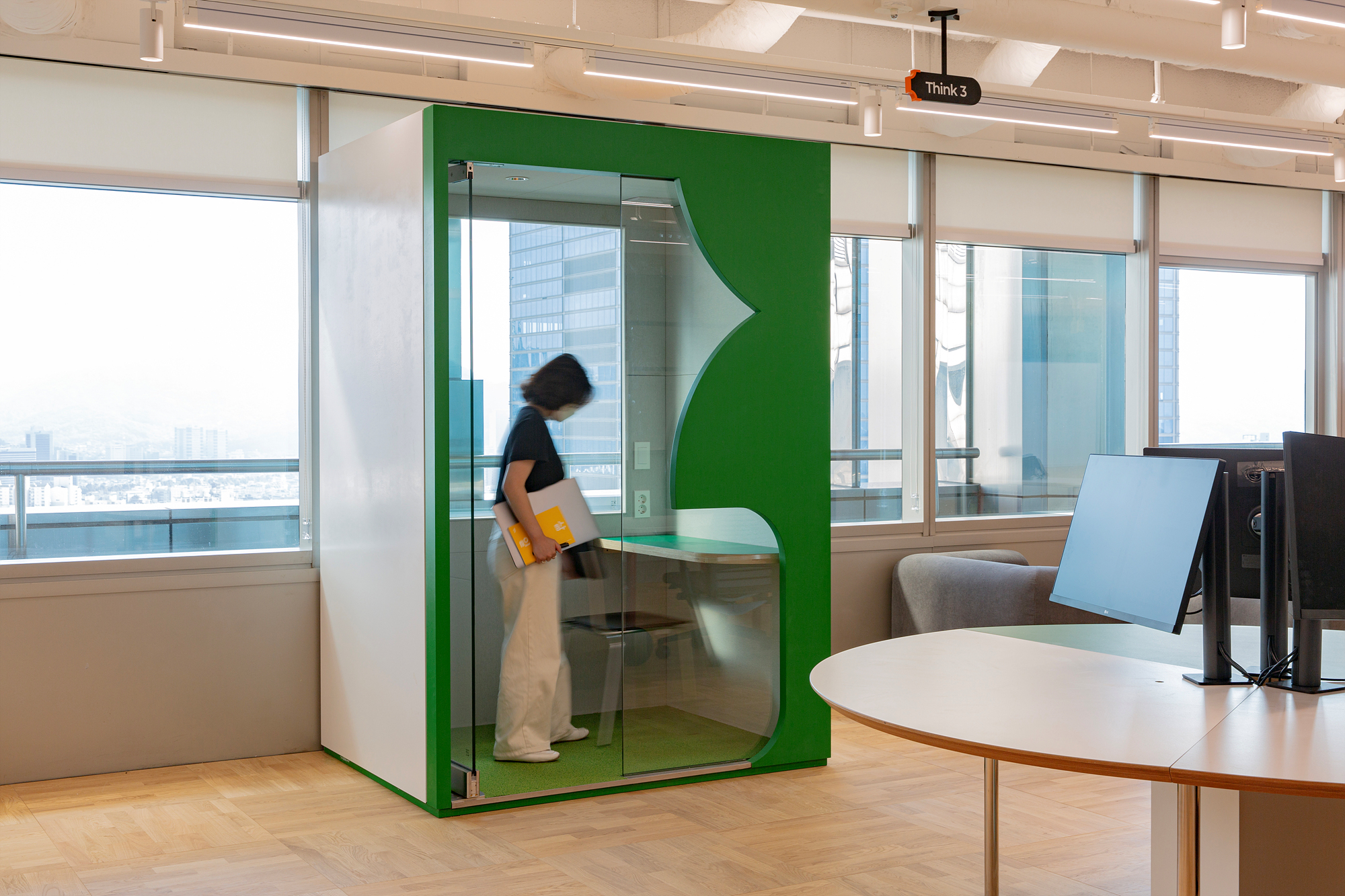 가장 크게 Office Zone, Meeting Zone, Auditorium, 휴식을 위한 공간들이 존재하며 각공간들 사이에 다양한 기능이 스며들어 있는 요소들을 배치하였습니다. Office Zone 에는 회전하는 벽체와 Core Zone 있는 휴게공간 및 캐쥬얼한 미팅이 가능한 공간, 폰부스와 집중업무 공간을 배치하였고, 천장에서 내려오는 콘센트, 이동식의자와 테이블은 모든 공간이 Flexible 하게 사용가능하게 계획 하였습니다.