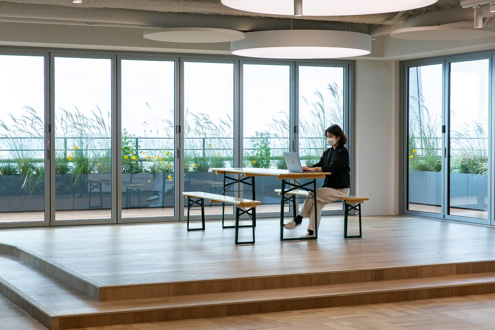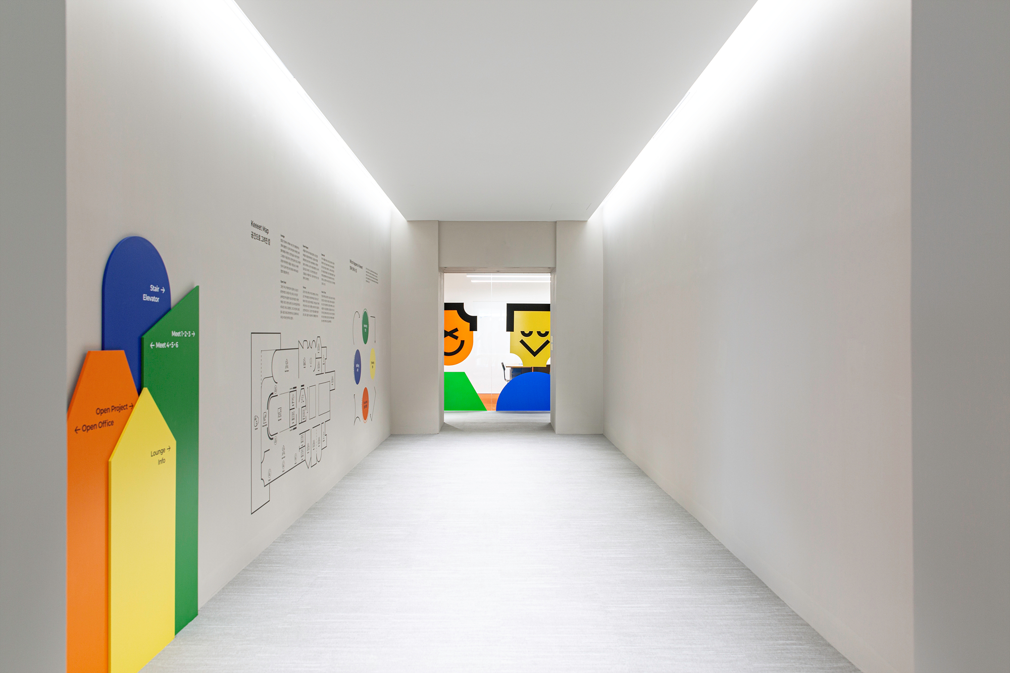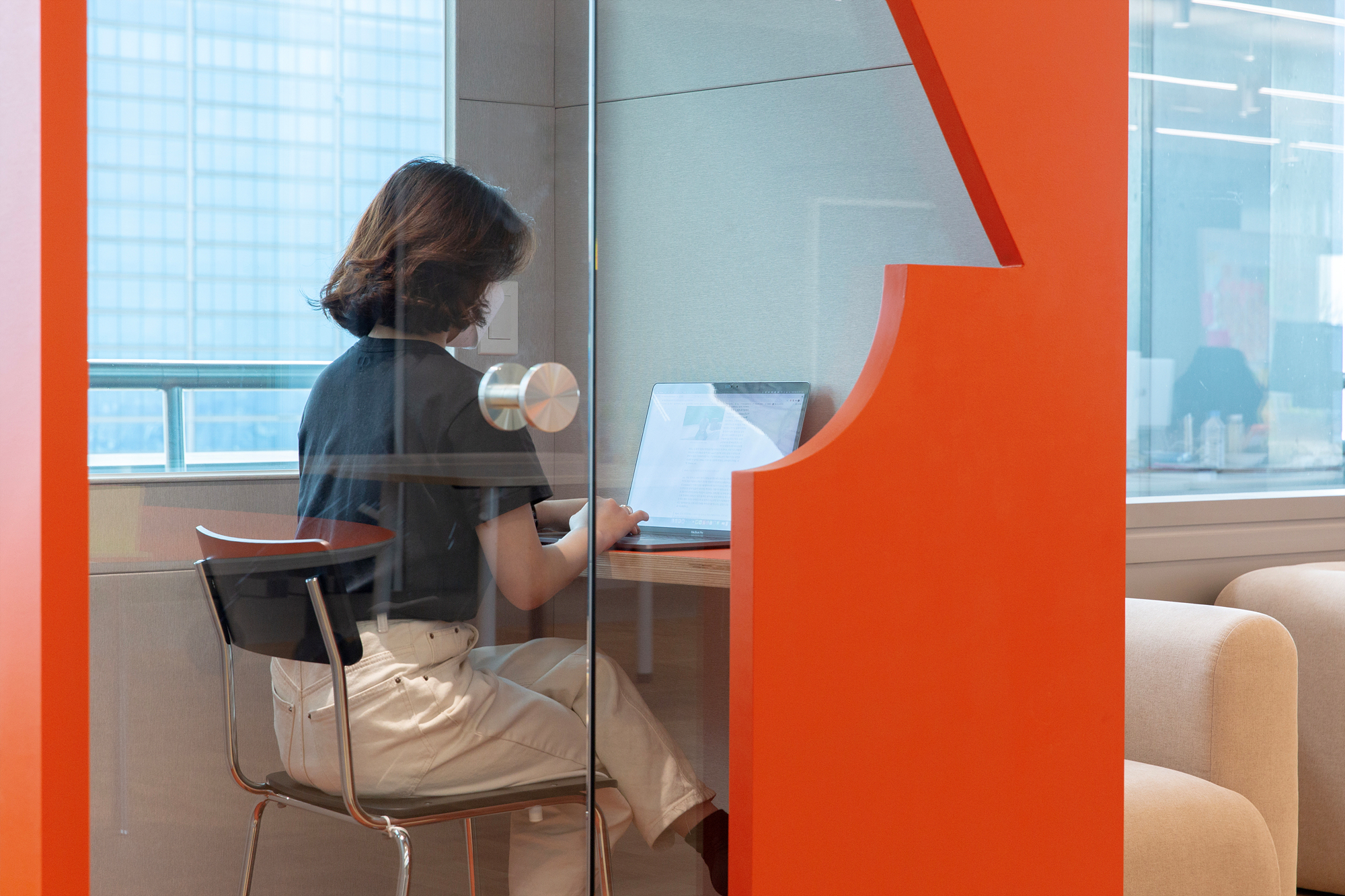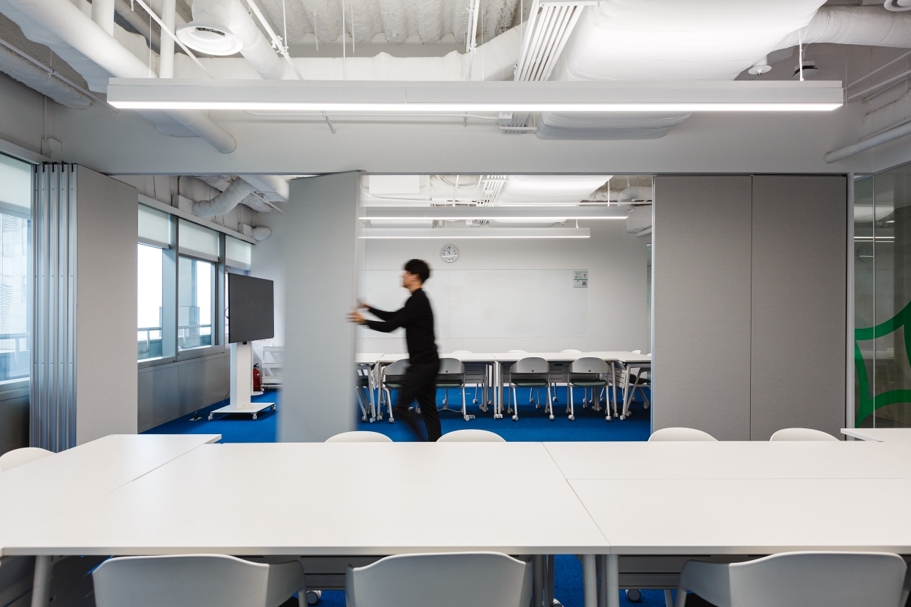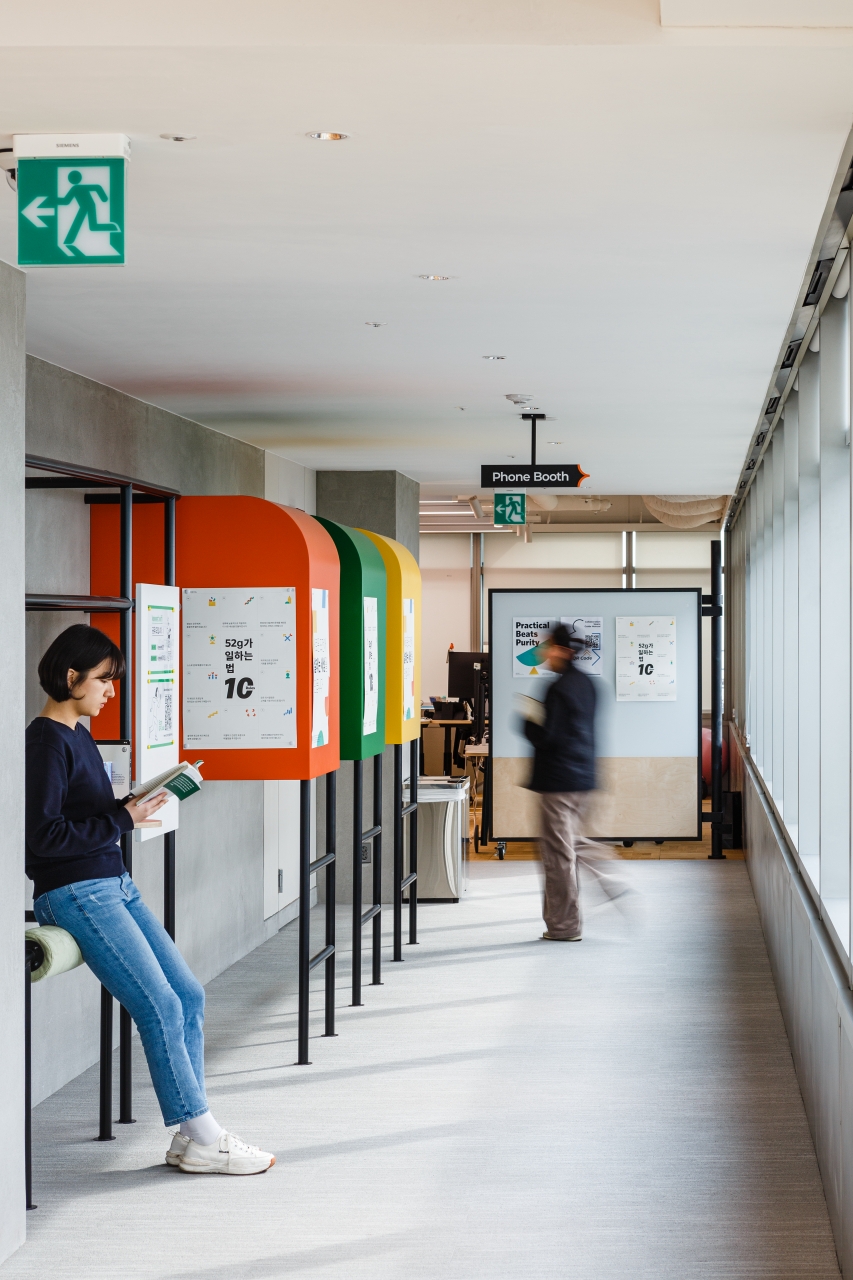 가장 크게 Office Zone, Meeting Zone, Auditorium, 휴식을 위한 공간들이 존재하며 각공간들 사이에 다양한 기능이 스며들어 있는 요소들을 배치하였습니다. Office Zone 에는 회전하는 벽체와 Core Zone 있는 휴게공간 및 캐쥬얼한 미팅이 가능한 공간, 폰부스와 집중업무 공간을 배치하였고, 천장에서 내려오는 콘센트, 이동식의자와 테이블은 모든 공간이 Flexible 하게 사용가능하게 계획 하였습니다.