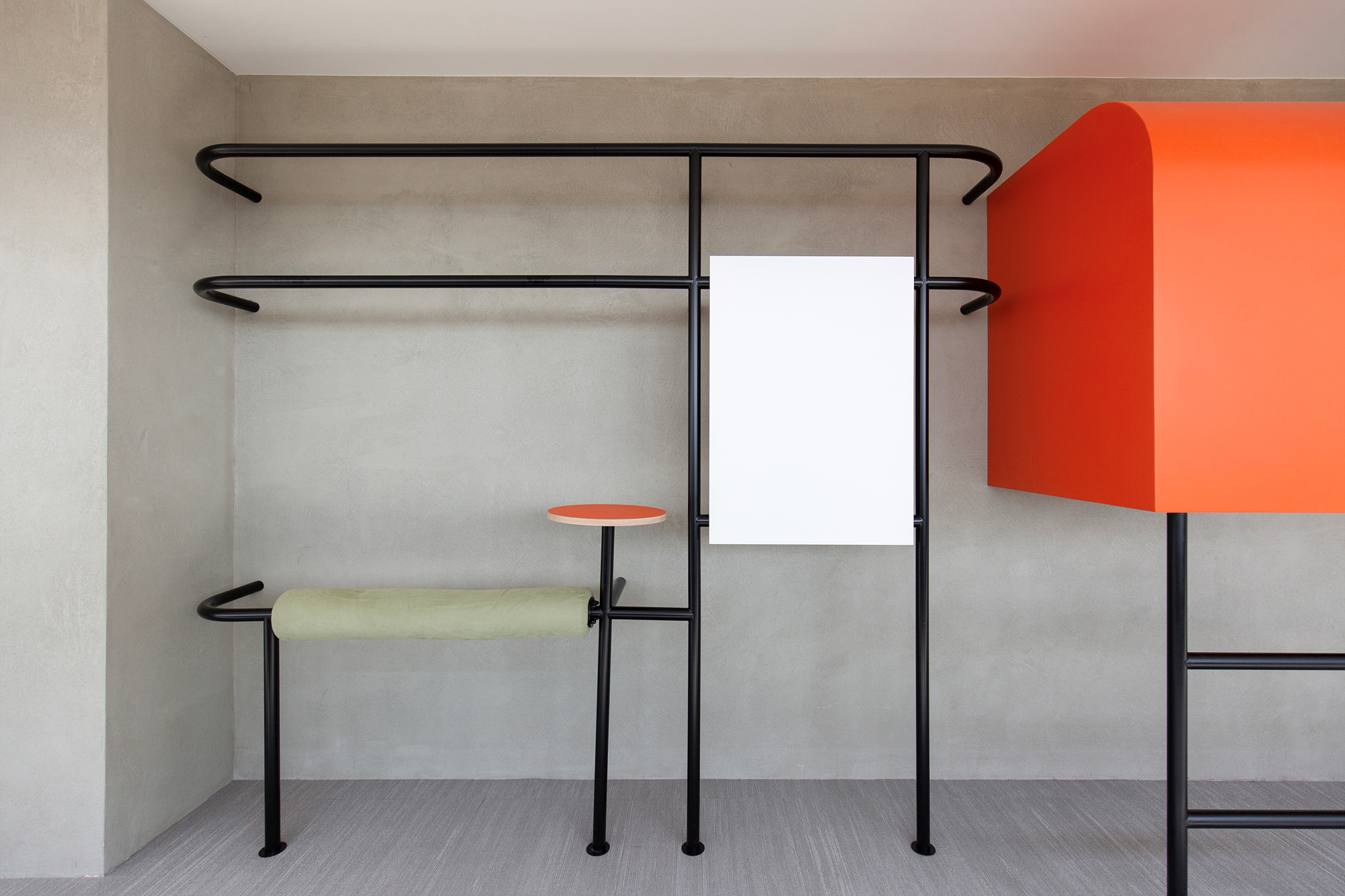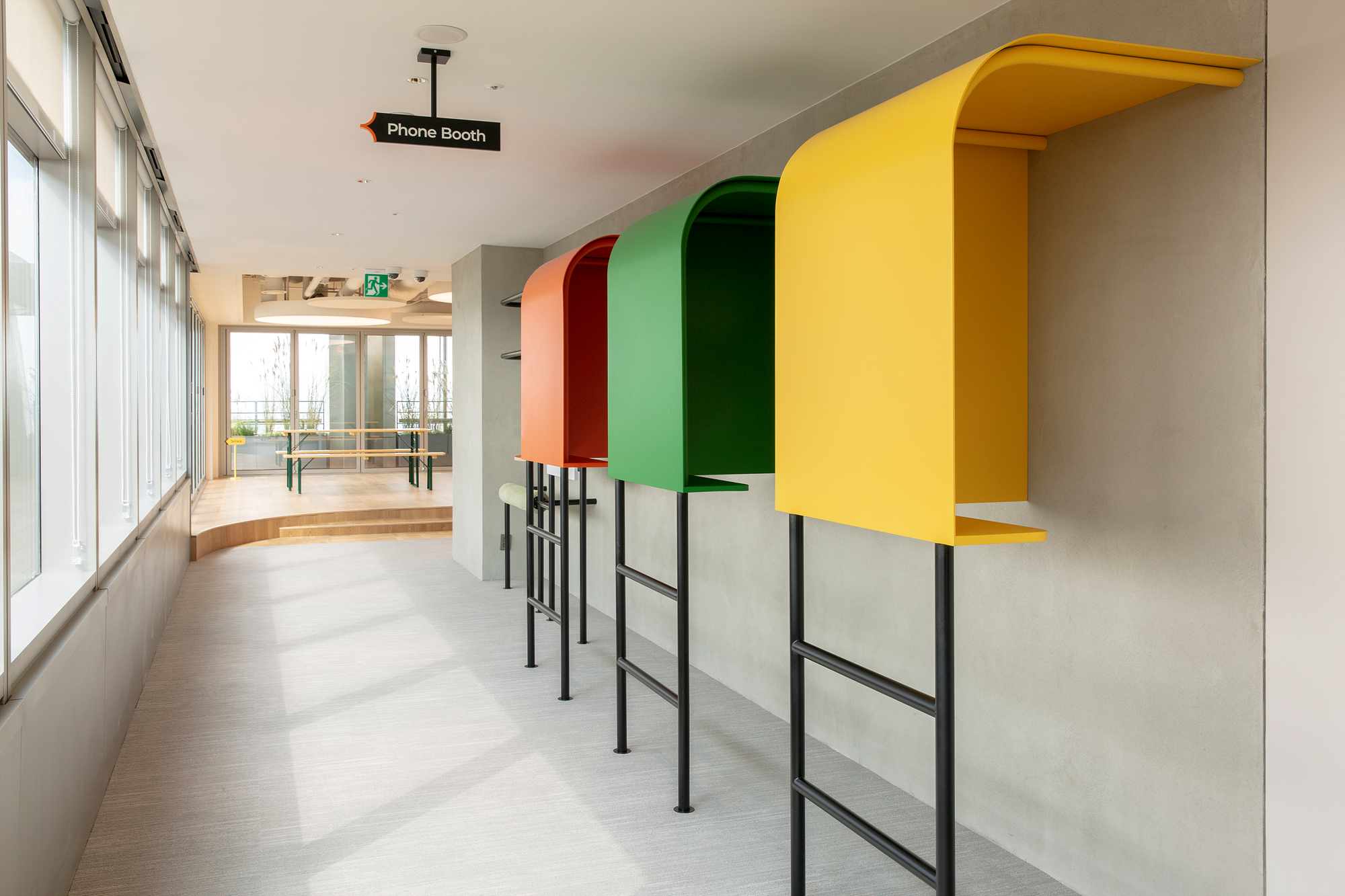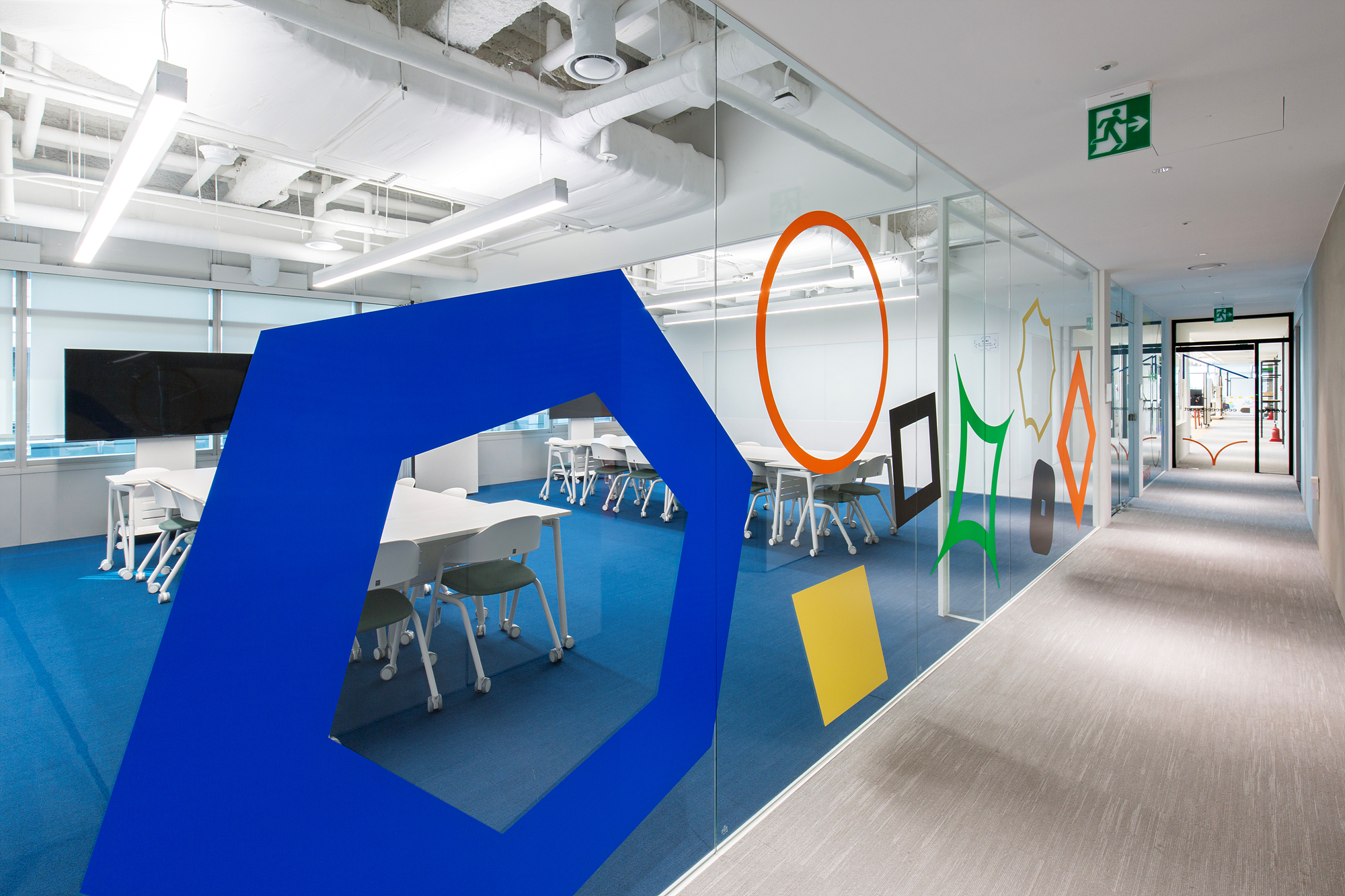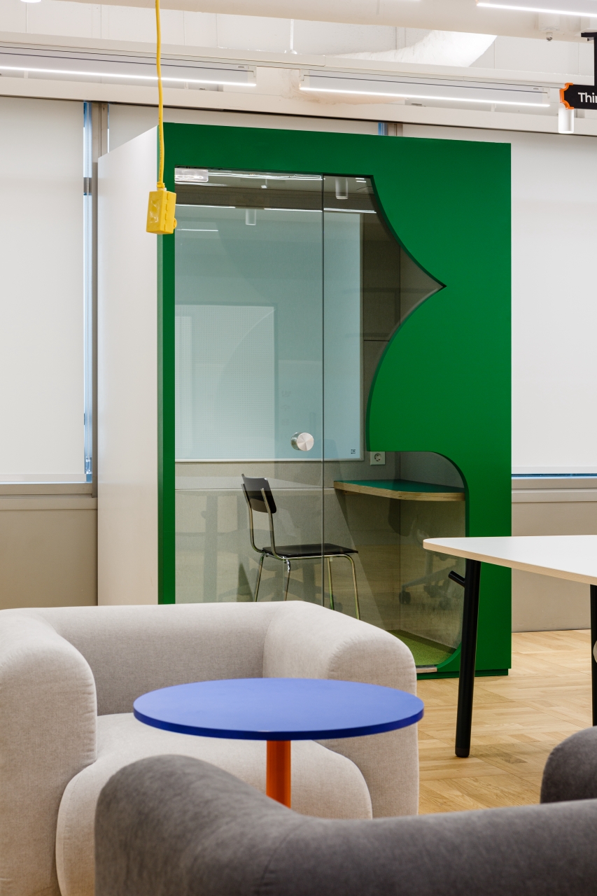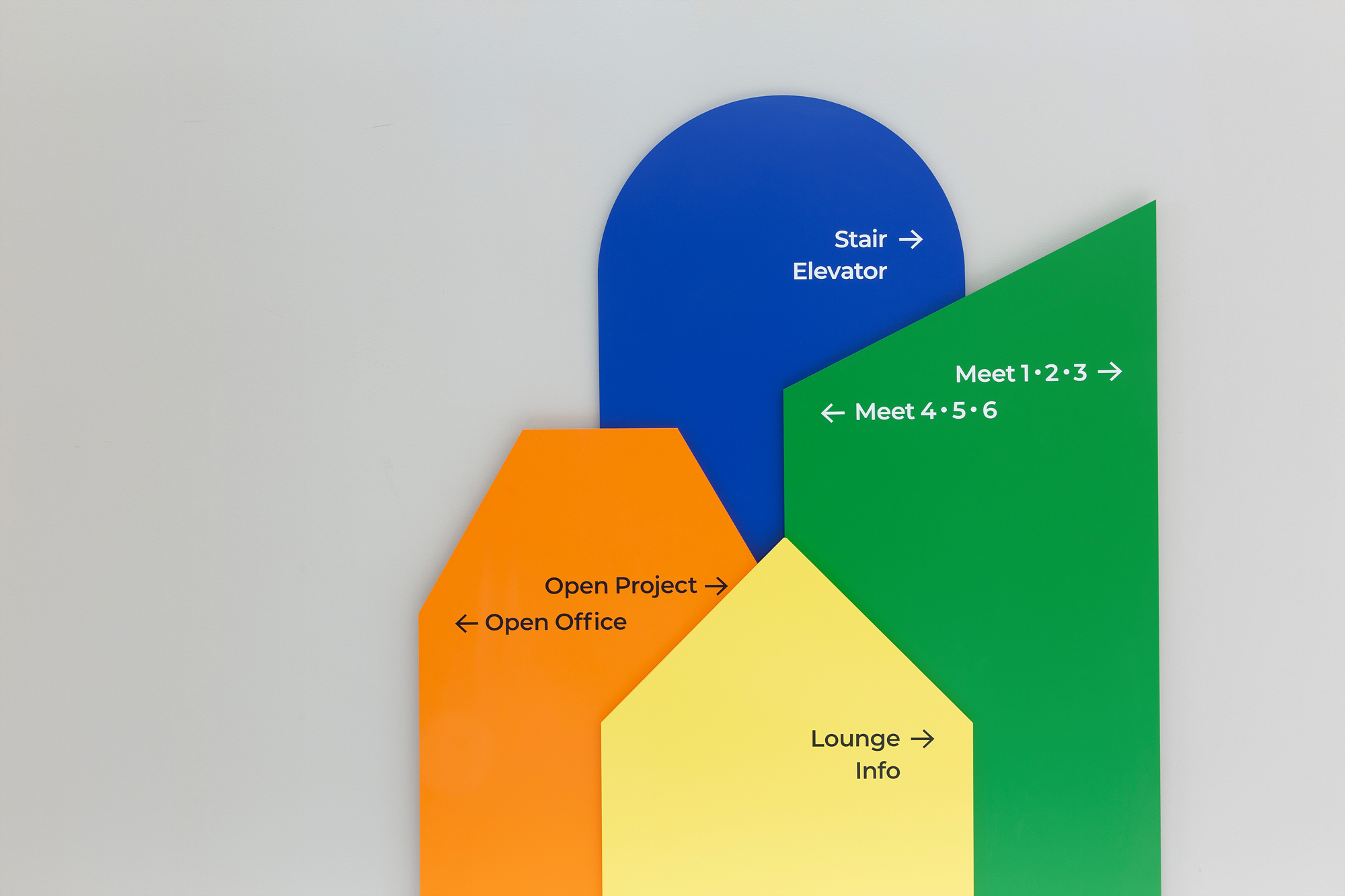 가장 크게 Office Zone, Meeting Zone, Auditorium, 휴식을 위한 공간들이 존재하며 각공간들 사이에 다양한 기능이 스며들어 있는 요소들을 배치하였습니다. Office Zone 에는 회전하는 벽체와 Core Zone 있는 휴게공간 및 캐쥬얼한 미팅이 가능한 공간, 폰부스와 집중업무 공간을 배치하였고, 천장에서 내려오는 콘센트, 이동식의자와 테이블은 모든 공간이 Flexible 하게 사용가능하게 계획 하였습니다.