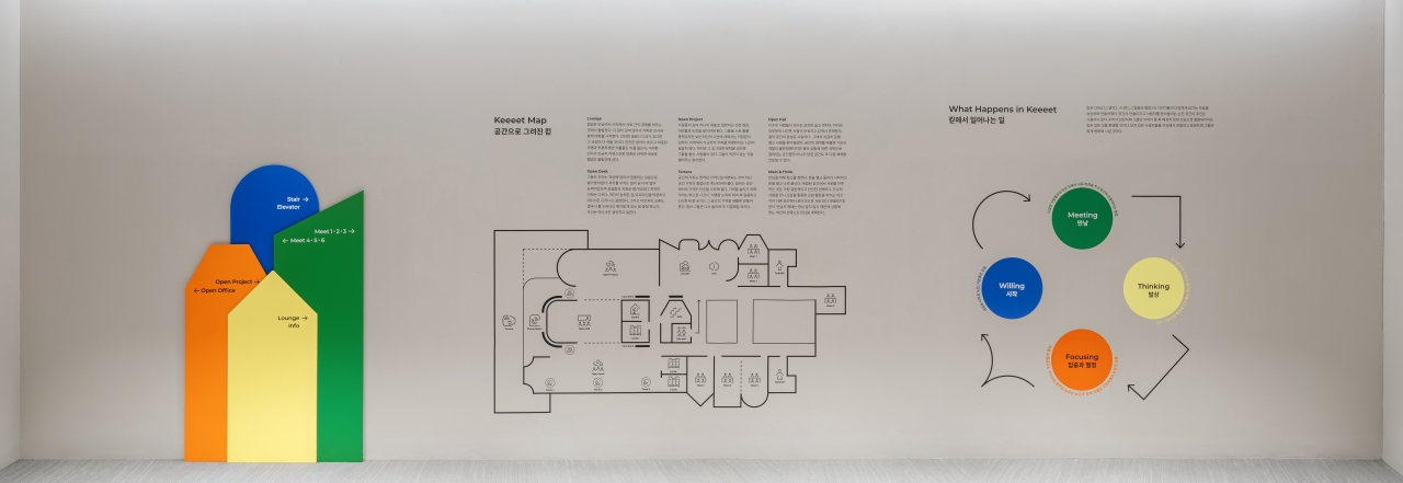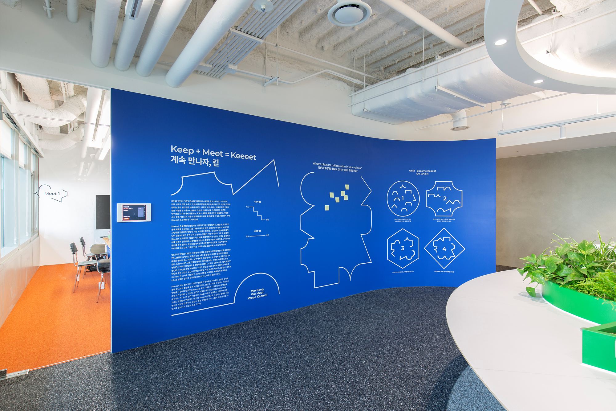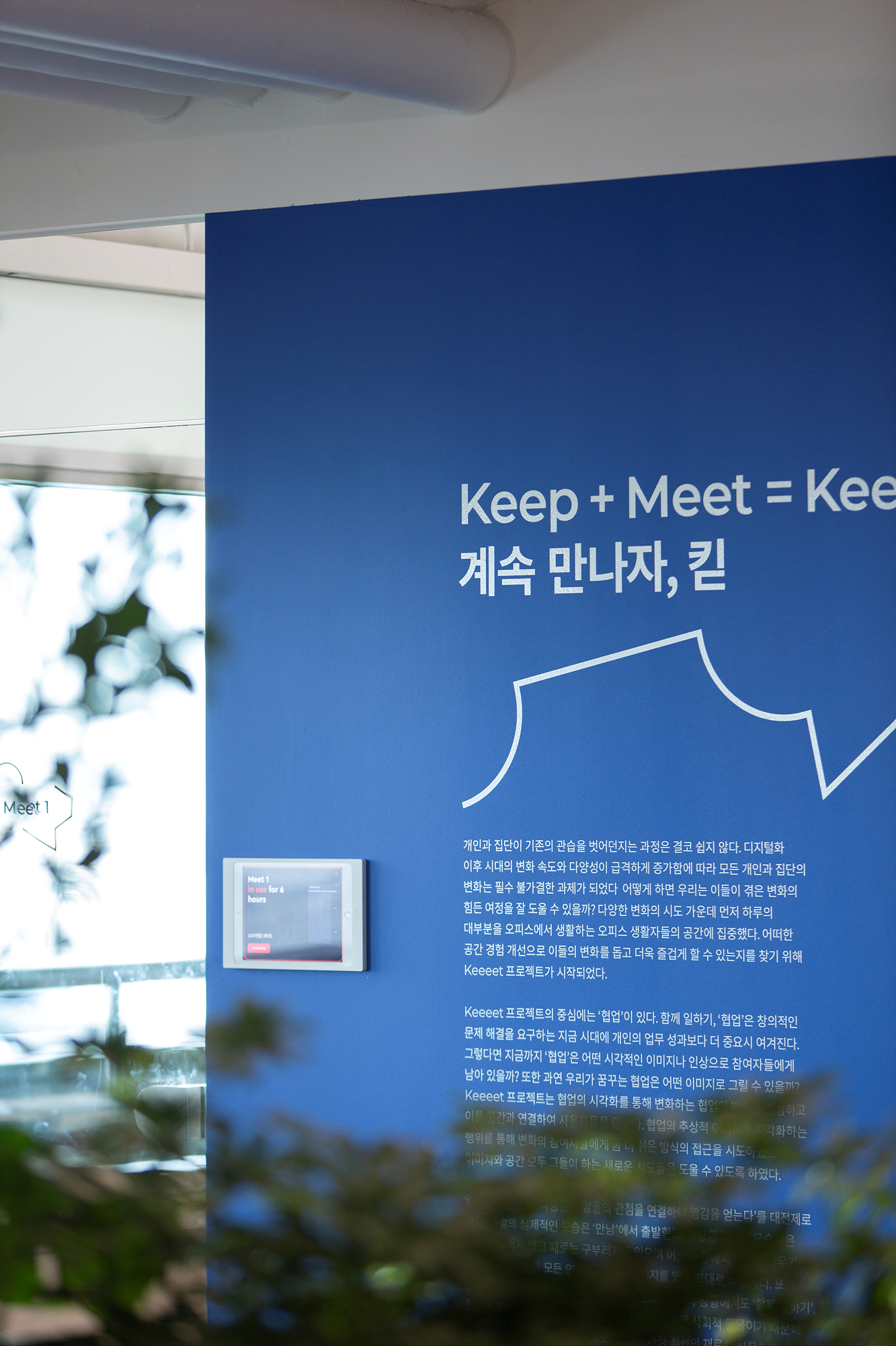 GS는 ‘keeeet 킫’ 이라는 이름의 내/외부 계열사들의 협업을 하는 공간을 기획 하였습니다. Keeeet 은 ‘Keep + meet’ 의 합성어로서 ‘만남을 지속해야 한다’ 는 의미를 담고 있습니다. Keeeet 킫은 이용자들의 행태를 유연하게 담아햐 한다는 고민하는 것에서 부터 시작 되었습니다. 모이고, 흩어지고, 독립적인 각각의 업무를 함께 어울어질 수 있도록 공간을 프로그램밍하고 업무가 가지고 있는 특성에 맞게 공간을 디자인 함으로써 이용자들로 하여금 활용도를 높이고 공간의 이용가치를 상승 시키고자 하였습니다.