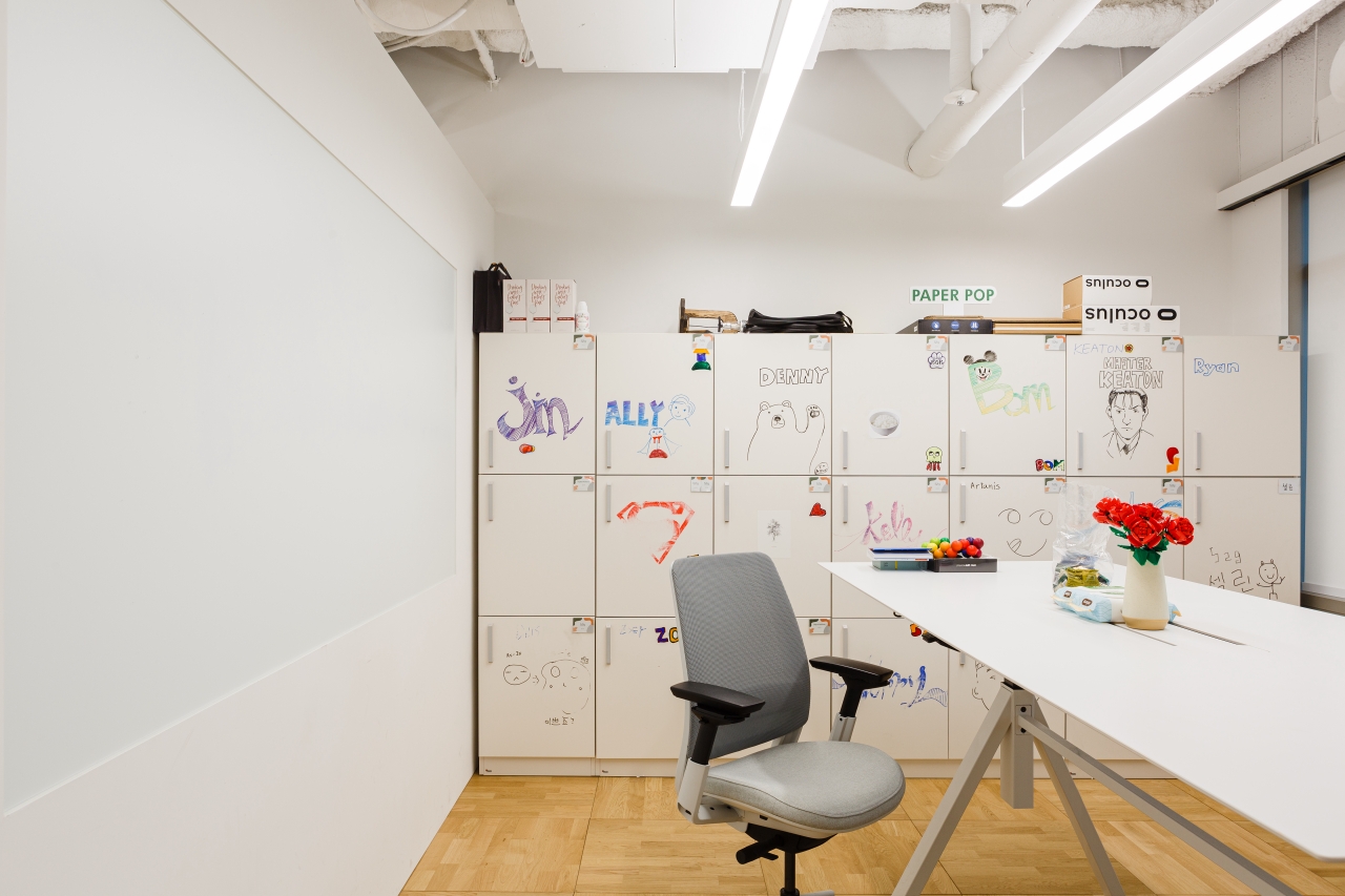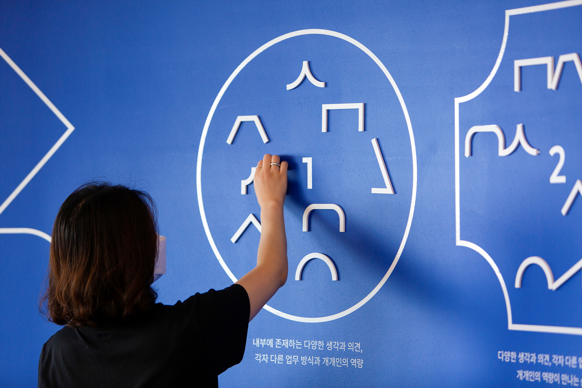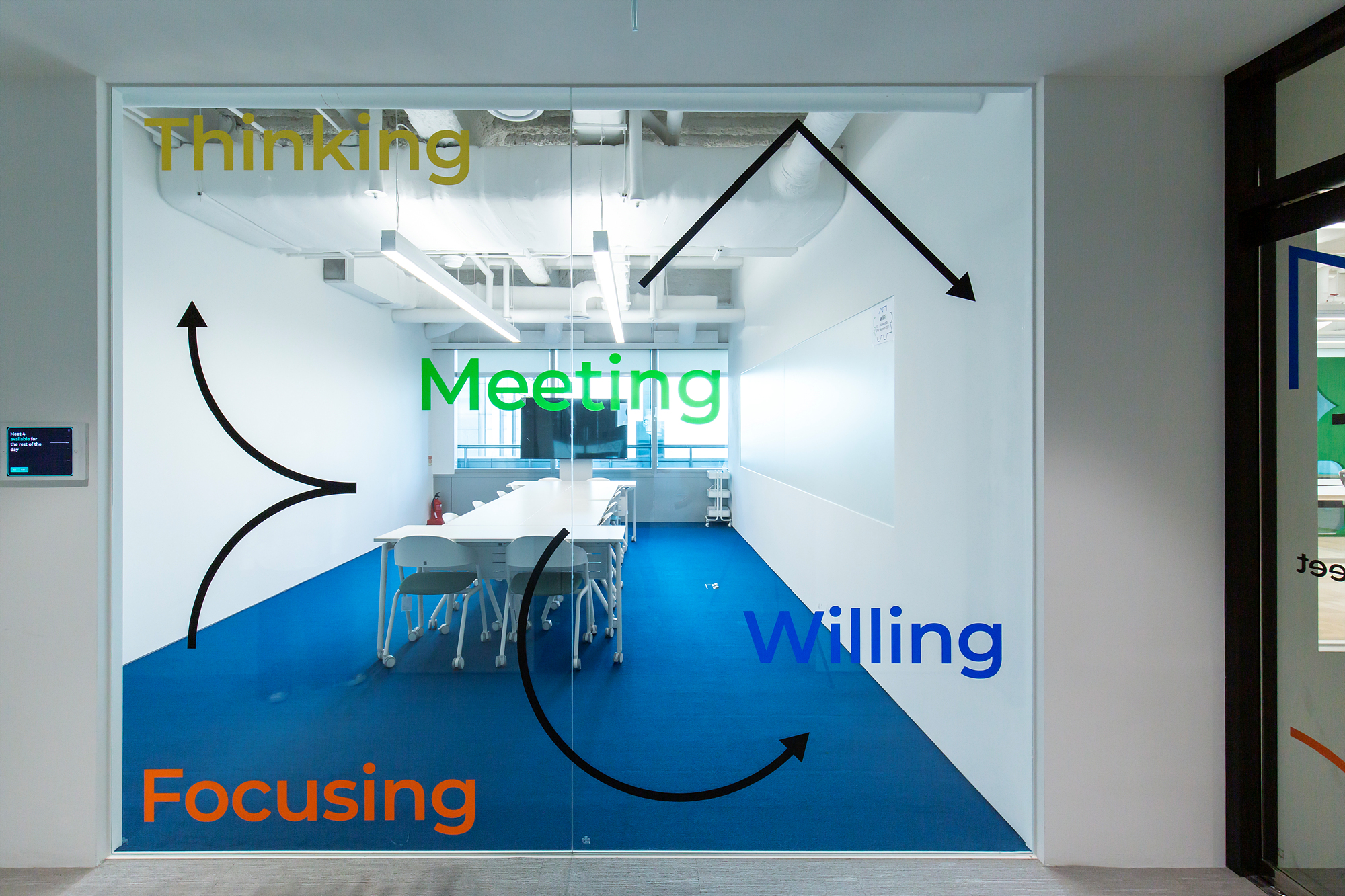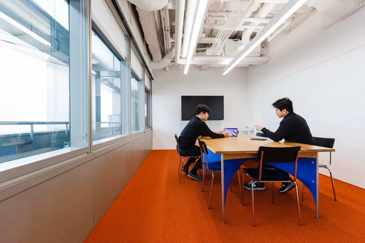 공간의 중심에는 카운터와 편하게 쉴 수 있는 라운지가 위치 해 있습니다. 이곳을 방문하는 모든 인원은 카운터 뒤의 파란색 벽을 만나게 되는데 이곳에서는 킫을 이용하고 있는 인원들의 정보나 킫이 담고 있는 철학을 보여주는 게시판의 용도로 사용되기도 합니다. 회의실은 적절한 공간에 배치되어 있어, 협업에 있어 유연성있는 회의를 만들어 줍니다. 판서가 가능한 벽이나 모니터가 설치된 회의실에 킫의 아이덴티티를 적용하여 킫만의 회의실이라는 이미지를 줄 수 있습니다. 업무공간의 움직이는 칠판이나 책상 같은 하드웨어적인면도 있겠지만 한발자국 이동하면 휴식과 캐쥬얼한 미팅이 가능한 공간이 곳곳에 놓여 있는 것 새로운 협업 문화를 만들어 가는 것이 킫의 목표지점 입니다.
