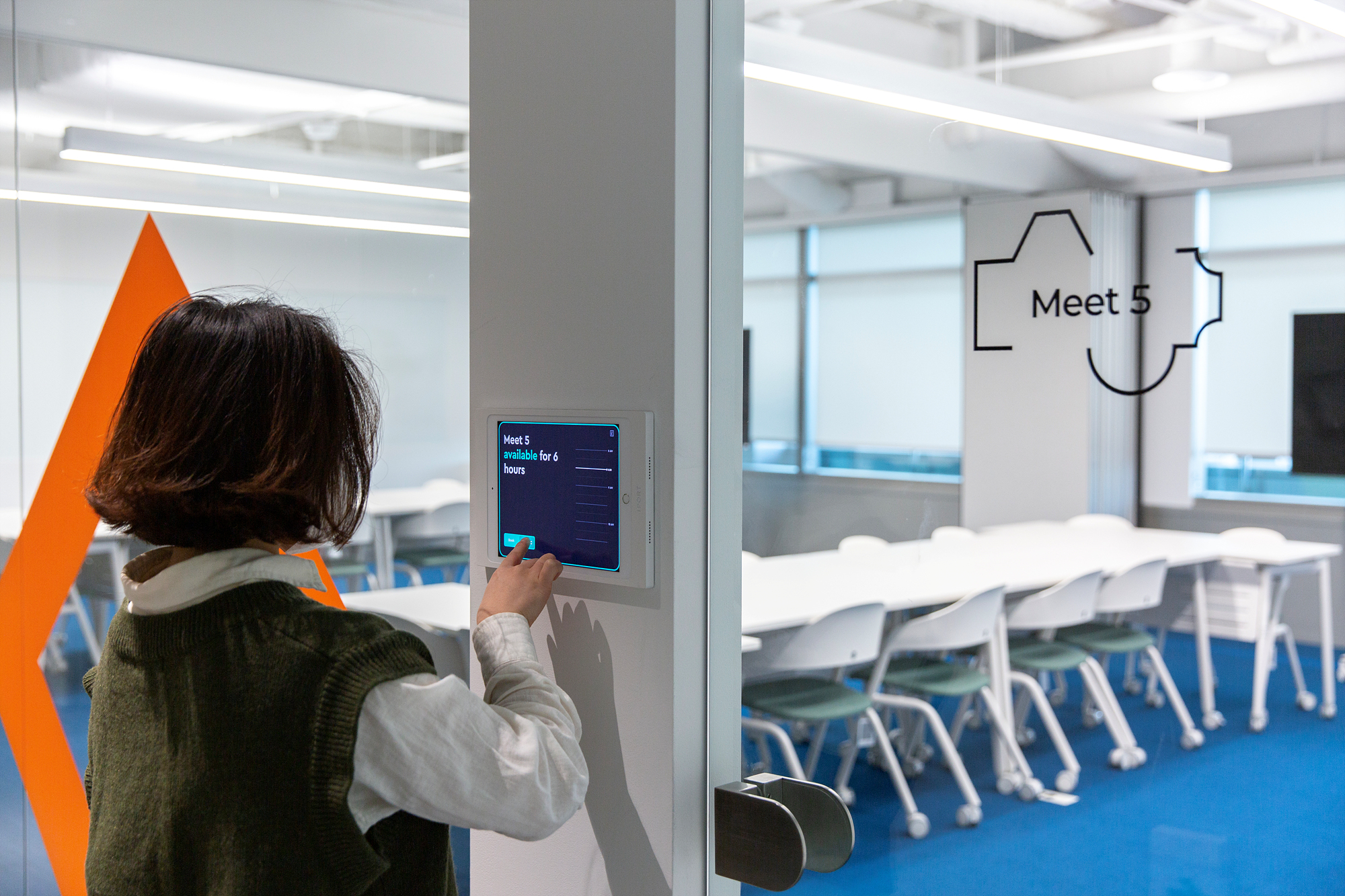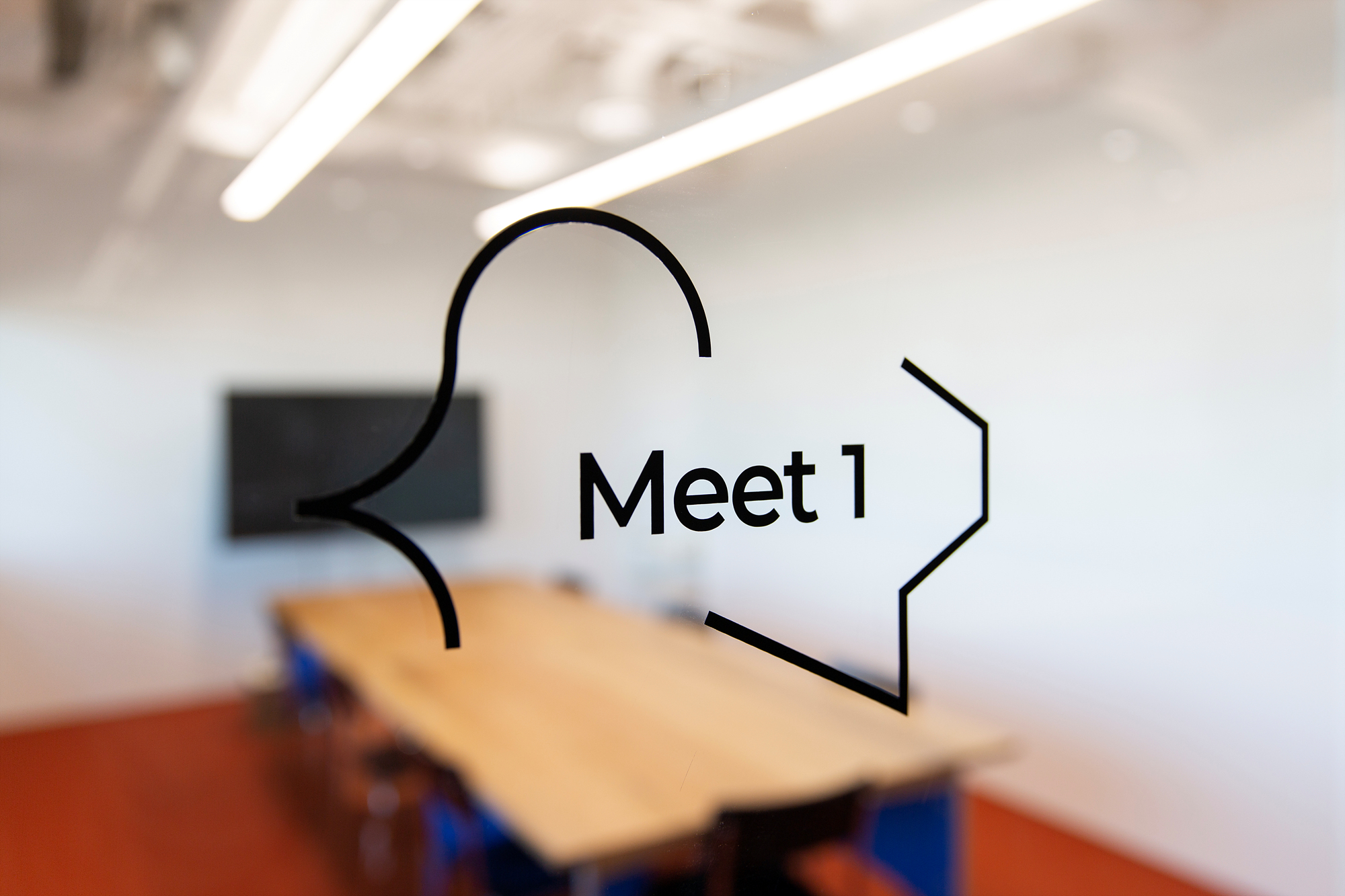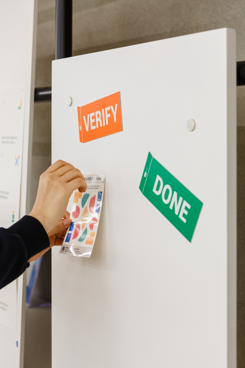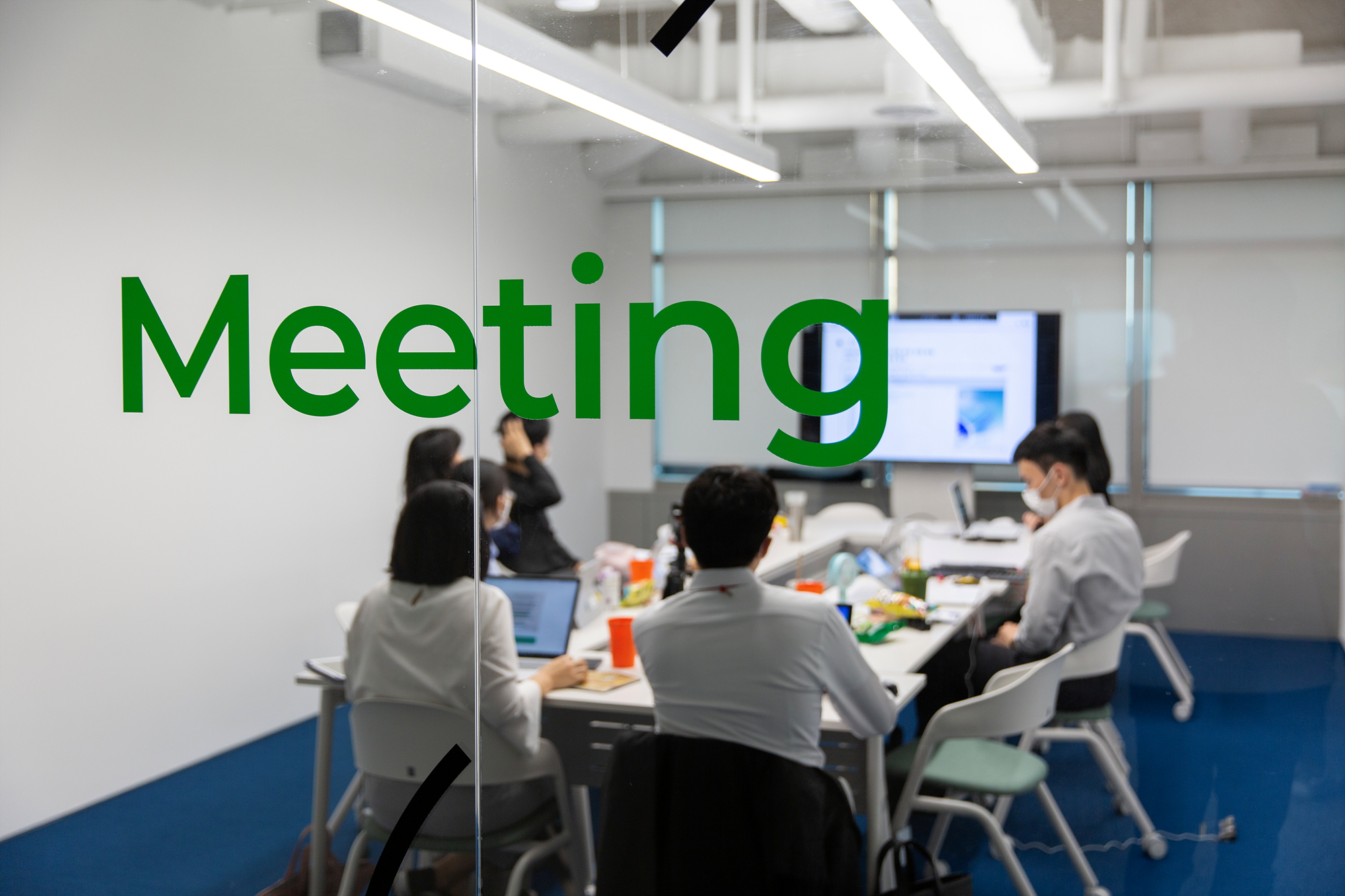 공간의 중심에는 카운터와 편하게 쉴 수 있는 라운지가 위치 해 있습니다. 이곳을 방문하는 모든 인원은 카운터 뒤의 파란색 벽을 만나게 되는데 이곳에서는 킫을 이용하고 있는 인원들의 정보나 킫이 담고 있는 철학을 보여주는 게시판의 용도로 사용되기도 합니다. 회의실은 적절한 공간에 배치되어 있어, 협업에 있어 유연성있는 회의를 만들어 줍니다. 판서가 가능한 벽이나 모니터가 설치된 회의실에 킫의 아이덴티티를 적용하여 킫만의 회의실이라는 이미지를 줄 수 있습니다. 업무공간의 움직이는 칠판이나 책상 같은 하드웨어적인면도 있겠지만 한발자국 이동하면 휴식과 캐쥬얼한 미팅이 가능한 공간이 곳곳에 놓여 있는 것 새로운 협업 문화를 만들어 가는 것이 킫의 목표지점 입니다.
