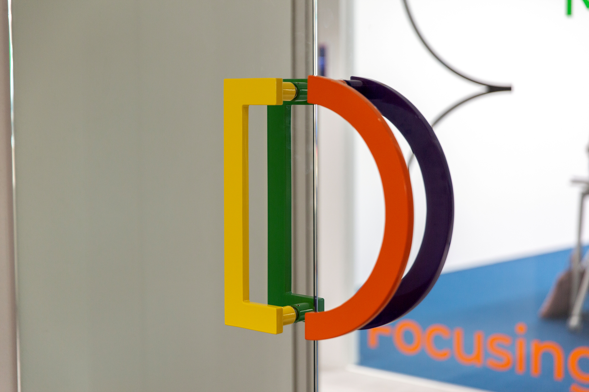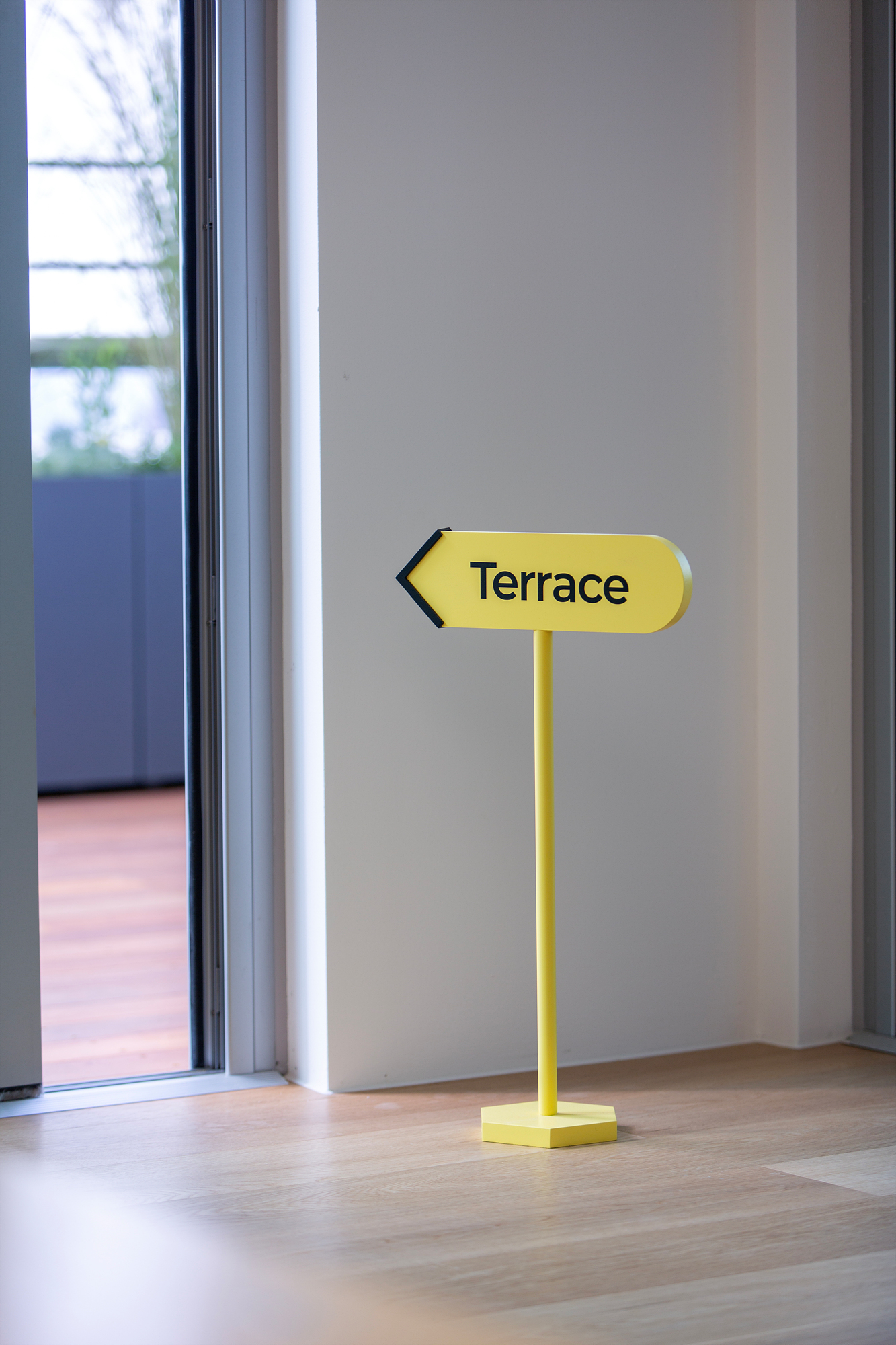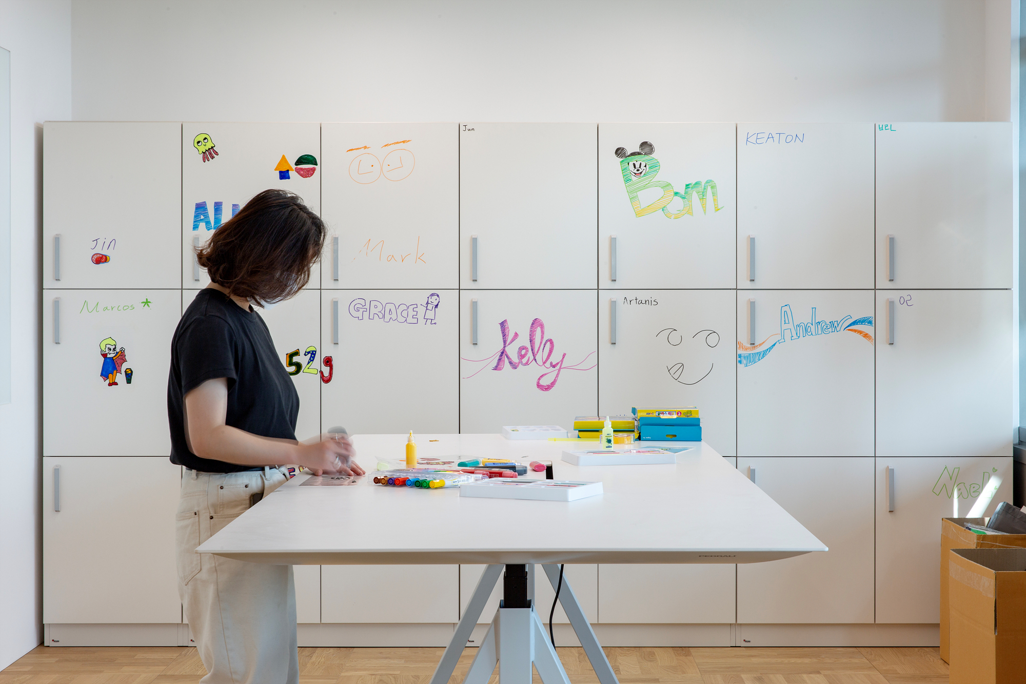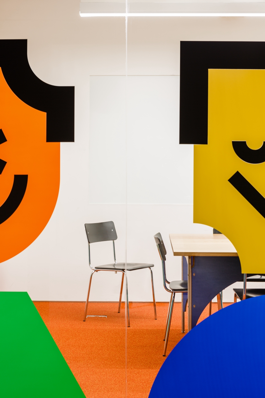 공간의 중심에는 카운터와 편하게 쉴 수 있는 라운지가 위치 해 있습니다. 이곳을 방문하는 모든 인원은 카운터 뒤의 파란색 벽을 만나게 되는데 이곳에서는 킫을 이용하고 있는 인원들의 정보나 킫이 담고 있는 철학을 보여주는 게시판의 용도로 사용되기도 합니다. 회의실은 적절한 공간에 배치되어 있어, 협업에 있어 유연성있는 회의를 만들어 줍니다. 판서가 가능한 벽이나 모니터가 설치된 회의실에 킫의 아이덴티티를 적용하여 킫만의 회의실이라는 이미지를 줄 수 있습니다. 업무공간의 움직이는 칠판이나 책상 같은 하드웨어적인면도 있겠지만 한발자국 이동하면 휴식과 캐쥬얼한 미팅이 가능한 공간이 곳곳에 놓여 있는 것 새로운 협업 문화를 만들어 가는 것이 킫의 목표지점 입니다.