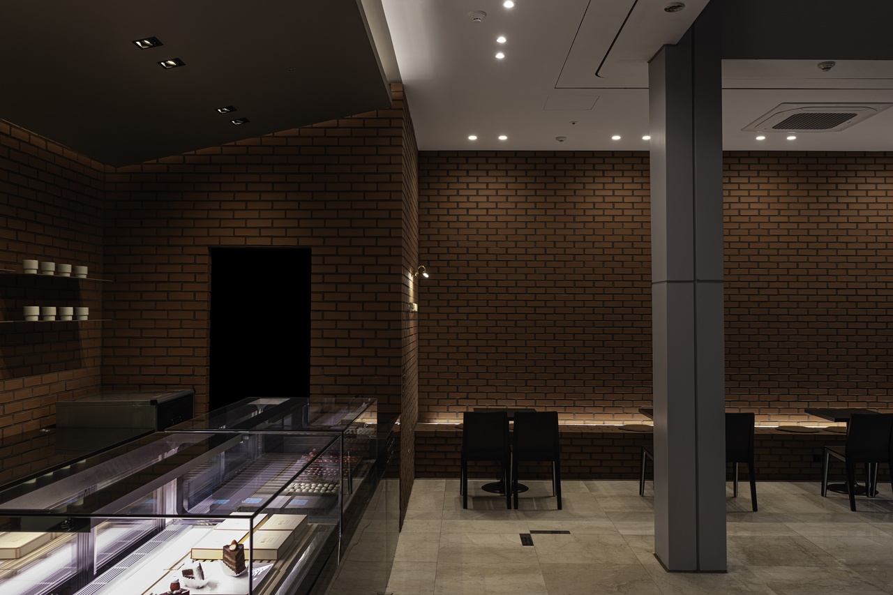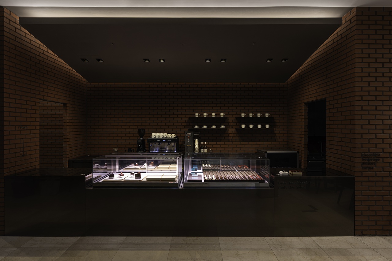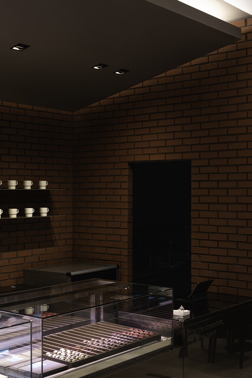 초콜릿과 닮은 톤과 질감을 가진 카운터 위에 얹힌 쇼케이스는 “이곳이 쇼콜라티에의 공간”임을 분명히 드러냅니다. 빛을 받은 초콜릿들은 공간이 단순한 포장재가 아님을 알려줍니다.
