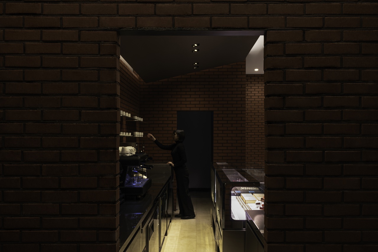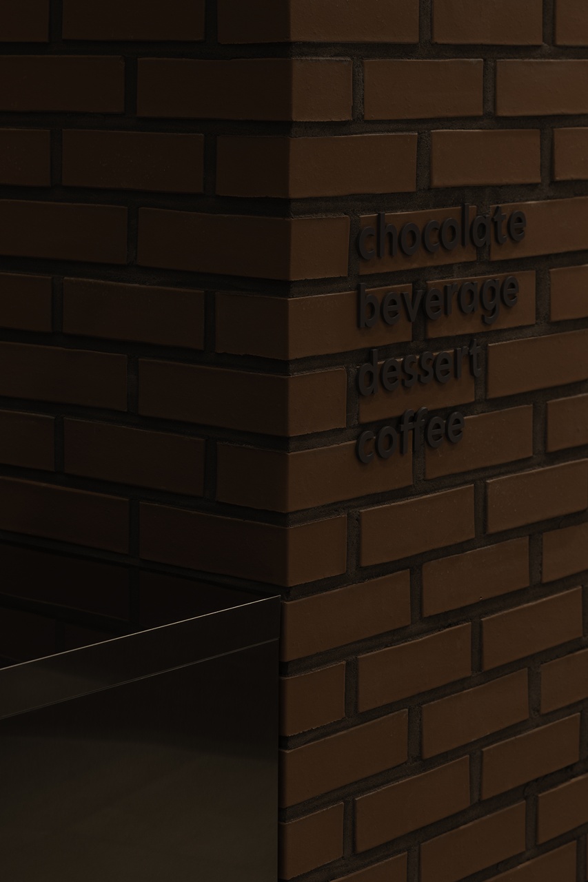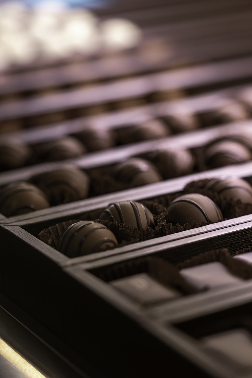 초콜릿과 닮은 톤과 질감을 가진 카운터 위에 얹힌 쇼케이스는 “이곳이 쇼콜라티에의 공간”임을 분명히 드러냅니다. 빛을 받은 초콜릿들은 공간이 단순한 포장재가 아님을 알려줍니다.