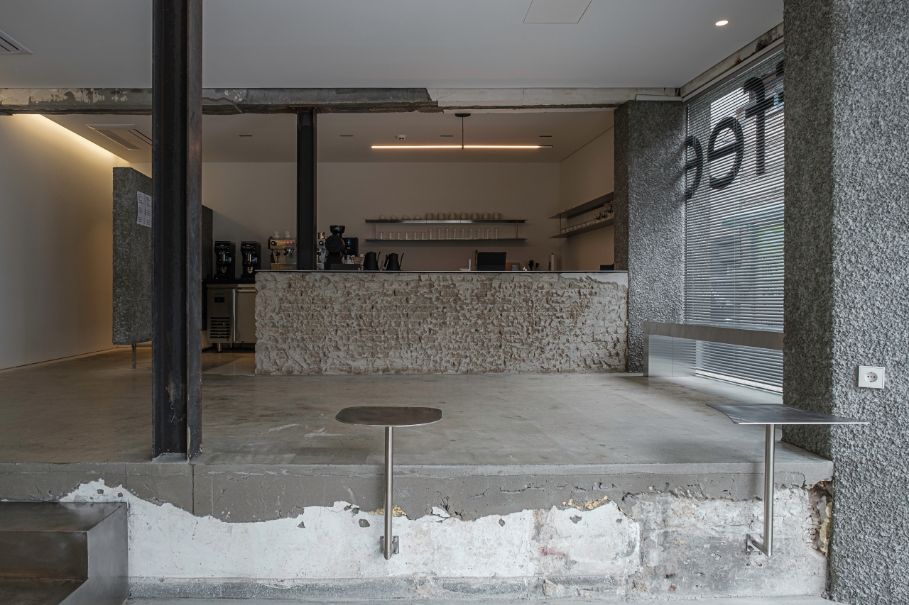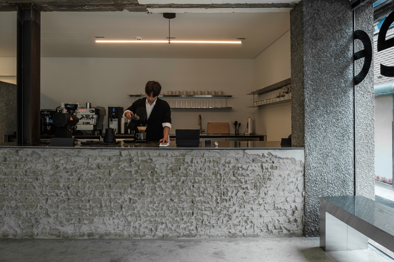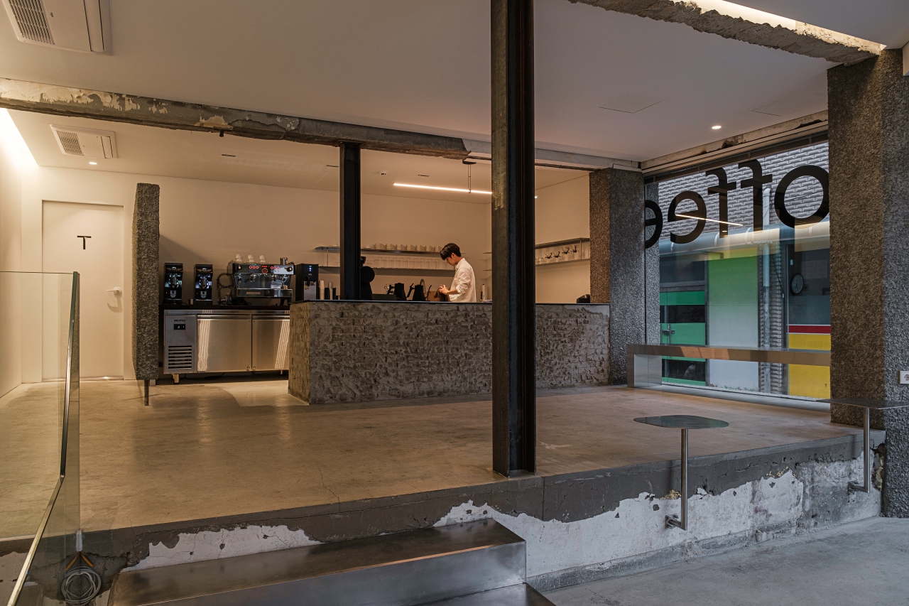 반지하 구조의 건물에 들어서면, 지면보다 한 단 높게 위치한 공간이 자연스러운 동선 분리를 만들어내며, 이를 걸터앉을 수 있는 좌석 공간으로 디자인해 반지하의 단점을 새로운 시선으로 재해석했습니다. 건물의 기존 아이덴티티는 거칠고 빈티지한 질감을 그대로 유지하고, 새롭게 설치된 구조물들은 현재의 감성과 조화를 이루는 마감재와 미니멀한 디테일로 공간의 구조미를 극대화했습니다.